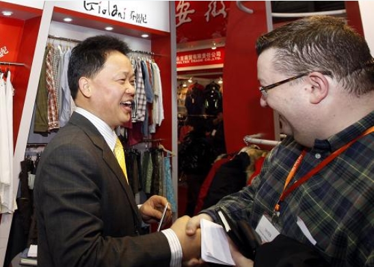 安徽一家服裝民營企業(yè)的負責人(左)與來自英國的客商達成訂貨意向后熱情握手(3月1日攝)。3月5日,為期5天的第22屆中國華東進出口商品交易會閉幕。本屆華交會出口總成交31.22億美元,比上屆增長9.98%。本屆華交會民營企業(yè)成交達17.53億美元,同比增長34.06%,占成交總額的56.13%。