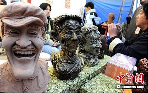 3月31日,觀眾在第三屆北京非物質文化遺產博覽會現場體驗民間手工藝人泥塑藝術創作。展臺前其創作的著名相聲大師馬三立、著名表演藝術家趙本山等名家泥塑像,吸引參觀者駐足。