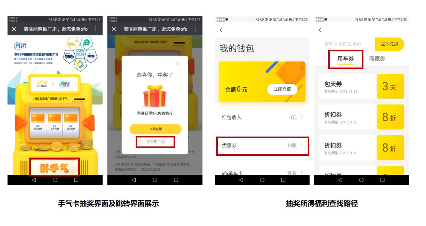 熟悉小黃車的用戶都知道,月卡和騎行券一直是ofo的固定福利模式,而全新上線的手氣卡,則將ofo的福利資源進行了全面整合。手氣卡是一個包含月卡、周卡、騎行券、折扣券等多重優惠福利的大禮包,用戶通過老虎機搖獎即可隨機獲得不同種類的優惠獎品。參與2018中國國際清潔能源科技推廣周與ofo小黃車聯名手氣卡的方式非常簡單,活動期內,用戶可通過推廣周官方微博、微信、EDM等平臺找到活動消息: