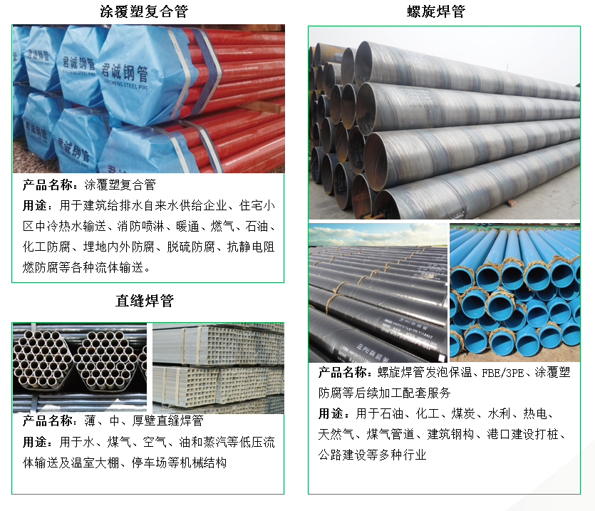 君誠管道集團(tuán)是中國制造業(yè)企業(yè)500強(qiáng)、中國民營企業(yè)制造業(yè)500強(qiáng)和中國產(chǎn)地名牌產(chǎn)品企業(yè)。集團(tuán)公司總部在北京,產(chǎn)銷基地坐落在——天津蔡公莊工業(yè)園區(qū)、山東焦橋南部工業(yè)園區(qū)和內(nèi)蒙古包頭九原工業(yè)園區(qū)。各子公司總占地近800畝,資產(chǎn)總計(jì)二十余億元,擁有熱鍍鋅鋼管生產(chǎn)線16條、直縫焊接鋼管生產(chǎn)線20條、襯塑復(fù)合管生產(chǎn)線11條、涂覆塑復(fù)合管生產(chǎn)線6條、螺旋縫雙面埋弧焊鋼管生產(chǎn)線6條、方矩鋼管生產(chǎn)線5條,以及預(yù)涂覆熱浸鋅鋼管、管接件等其他生產(chǎn)制造設(shè)施。君誠管道在全國產(chǎn)品行業(yè)規(guī)模綜合處于前列,制定中國鋼管國家標(biāo)準(zhǔn)——《低壓流體輸送用焊接鋼管》(GB/T3091)、國家電網(wǎng)系統(tǒng)《輸電線路鋼管塔用直縫焊管》、《直縫電焊鋼管》(GB/T13793)、《國家電網(wǎng)特高壓輸電線路用管》、《給水涂塑復(fù)合鋼管》(CJ/T 120)、《國家排水用小螺距鋼塑復(fù)合用管》、《內(nèi)襯內(nèi)覆不銹鋼復(fù)合鋼管管道工程技術(shù)規(guī)程》、《鋼塑復(fù)合管》(GB/T28897)等標(biāo)準(zhǔn)。年設(shè)計(jì)生產(chǎn)能力Φ21-Φ219mm熱鍍鋅鋼管120萬噸、Φ21-Φ273mm直縫焊管180萬噸、Φ219-Φ3020mm螺旋鋼管30萬噸、鋼塑復(fù)合管20萬噸、方矩鋼管20萬噸,以及預(yù)涂覆熱浸鋅鋼管、管接件等各類管道和其他相關(guān)產(chǎn)品年制造能力近400萬噸。