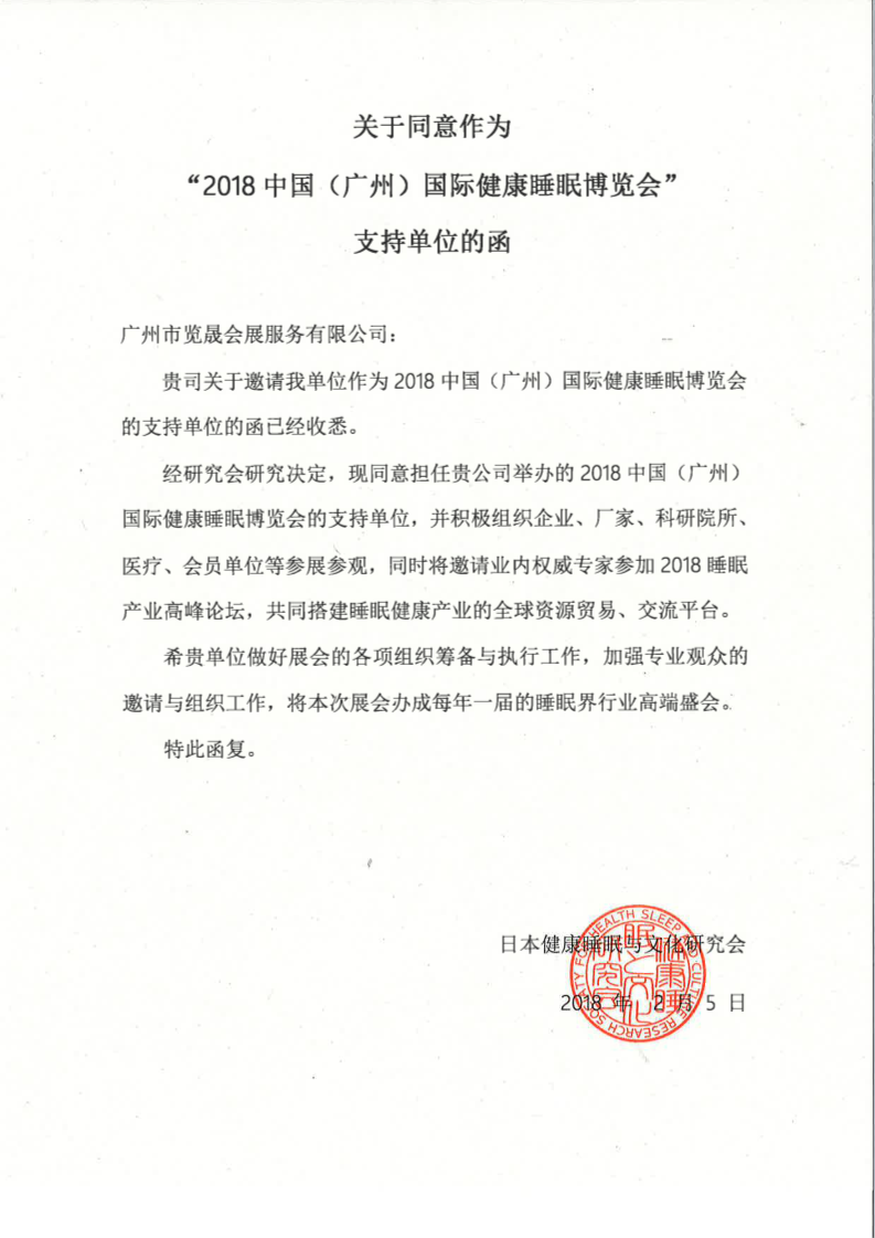 日本健康睡眠與文化研究會關于同意作為廣州睡博會支持單位的函