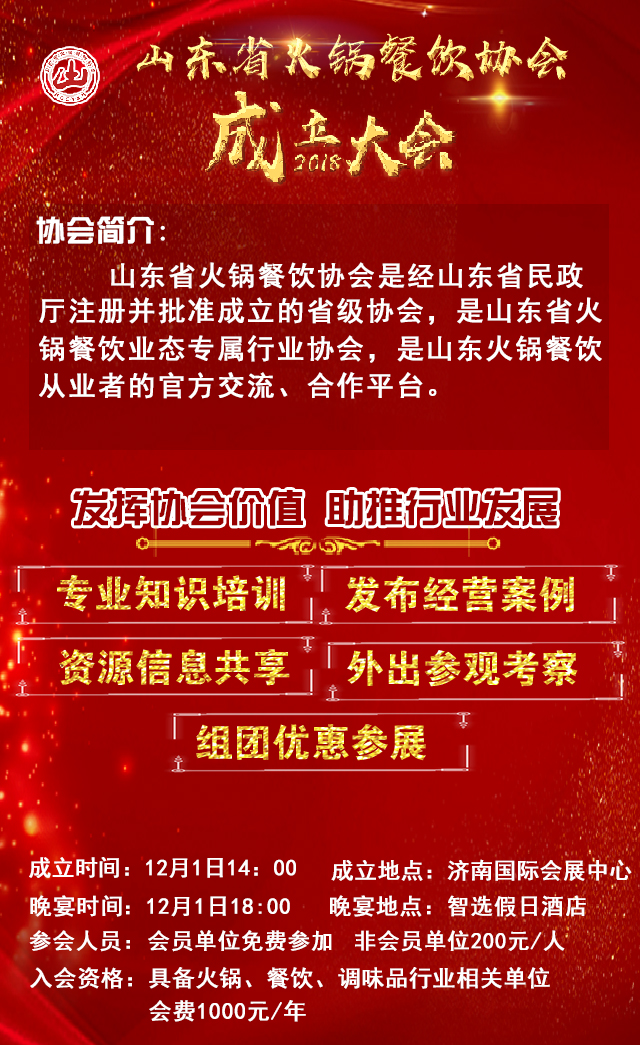 山東省火鍋餐飲協會是經山東省民政廳注冊并批準成立的省級協會,是山東省火鍋餐飲業態專屬行業協會,是山東火鍋餐飲從業者的官方交流、合作平臺。協會貫徹落實政府“食安山東”品牌建設,為山東火鍋餐飲行業的上中下游企業搭橋引線,做好行業的規范和服務工作。給大家搭建一個信息交流、資源共享、互幫互助、抱團發展的平臺。
