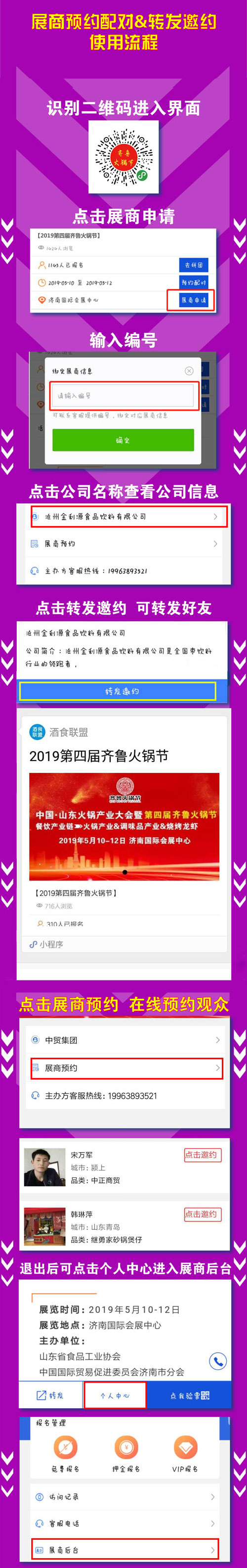 展商通過小程序報名后可以提前查看報名觀眾并與觀眾預約,展商還可以轉發(fā)邀約觀眾前來參加本屆齊魯火鍋節(jié)。預約配對與轉發(fā)邀約流程如下: