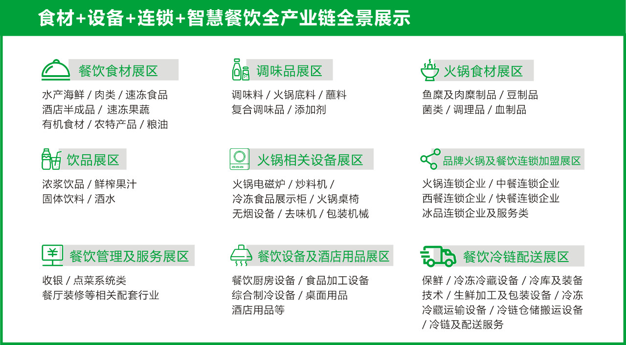 本屆展會規模升級,60000㎡展示面積,設置5大展館,9大展區,2000多家參展企業,展示餐飲食材、調味品、火鍋食材及用品、餐飲設備及酒店用品、咖啡飲品、連鎖加盟、冷鏈物流等相關的萬款產品。同時特設餐飲冷鏈配送展區、餐飲食材加工與包裝展區。展區主題不斷豐富,展品覆蓋餐飲全產業鏈。