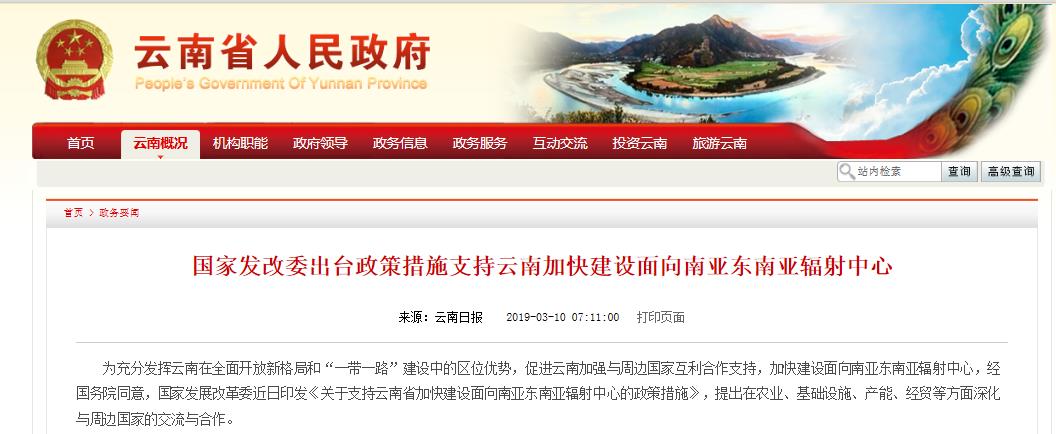 為充分發揮云南在全面開放新格局和“一帶一路”建設中的區位優勢,促進云南加強與周邊國家互利合作支持,加快建設面向南亞東南亞輻射中心,經國務院同意,國家發展改革委近日印發《關于支持云南省加快建設面向南亞東南亞輻射中心的政策措施》,提出在基礎設施、產能、經貿等方面深化與周邊國家的交流與合作,支持云南建設海外倉、境外展銷中心、國際快件監管中心;推進瀾滄江-湄公河等跨境經濟合作,務實推進中緬、中越、中老跨境經濟合作區建設。