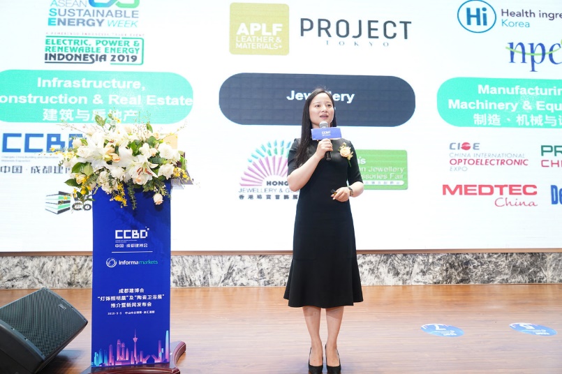 發(fā)布會(huì)首先由英富曼Informa Markets中國(guó)董事總經(jīng)理龔康康發(fā)表致辭,她指出,成都建博會(huì)與英富曼集團(tuán)牽手已經(jīng)三年了,無論是從展會(huì)的規(guī)模還是影響力上都獲得很大的提升。這次我們與中國(guó)建筑材料流通協(xié)會(huì)共同打造“燈飾照明”和“陶瓷衛(wèi)浴”兩個(gè)全新的板塊,相信一定能讓成都建博會(huì)如虎添翼,不僅保持在中西部首屈一指的地位,也將成為在全國(guó)極具影響力的重點(diǎn)品牌展會(huì)。