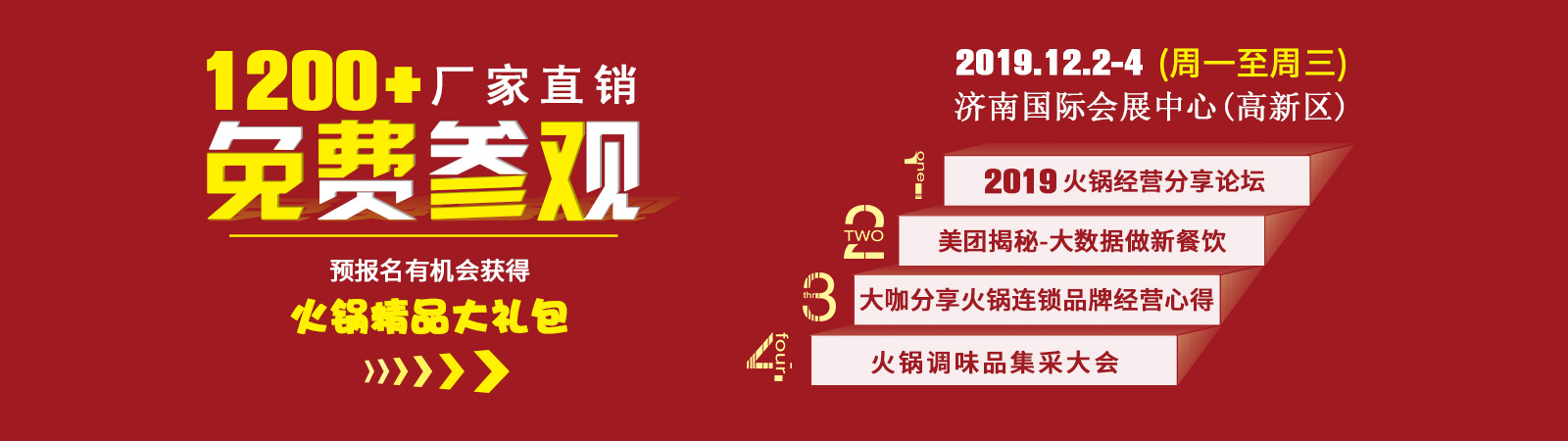 中國火鍋產業鏈博覽會(濟南),每年定期于5月和12月在山東濟南舉辦。累計展出面積120000m,參展企業4000余家,總計接待魯、豫、冀、蘇、皖、晉、陜等省市11萬余名專業采購商到會,已成為山東乃至北方火鍋餐飲行業最具知名:度和權威性的展覽會之一。