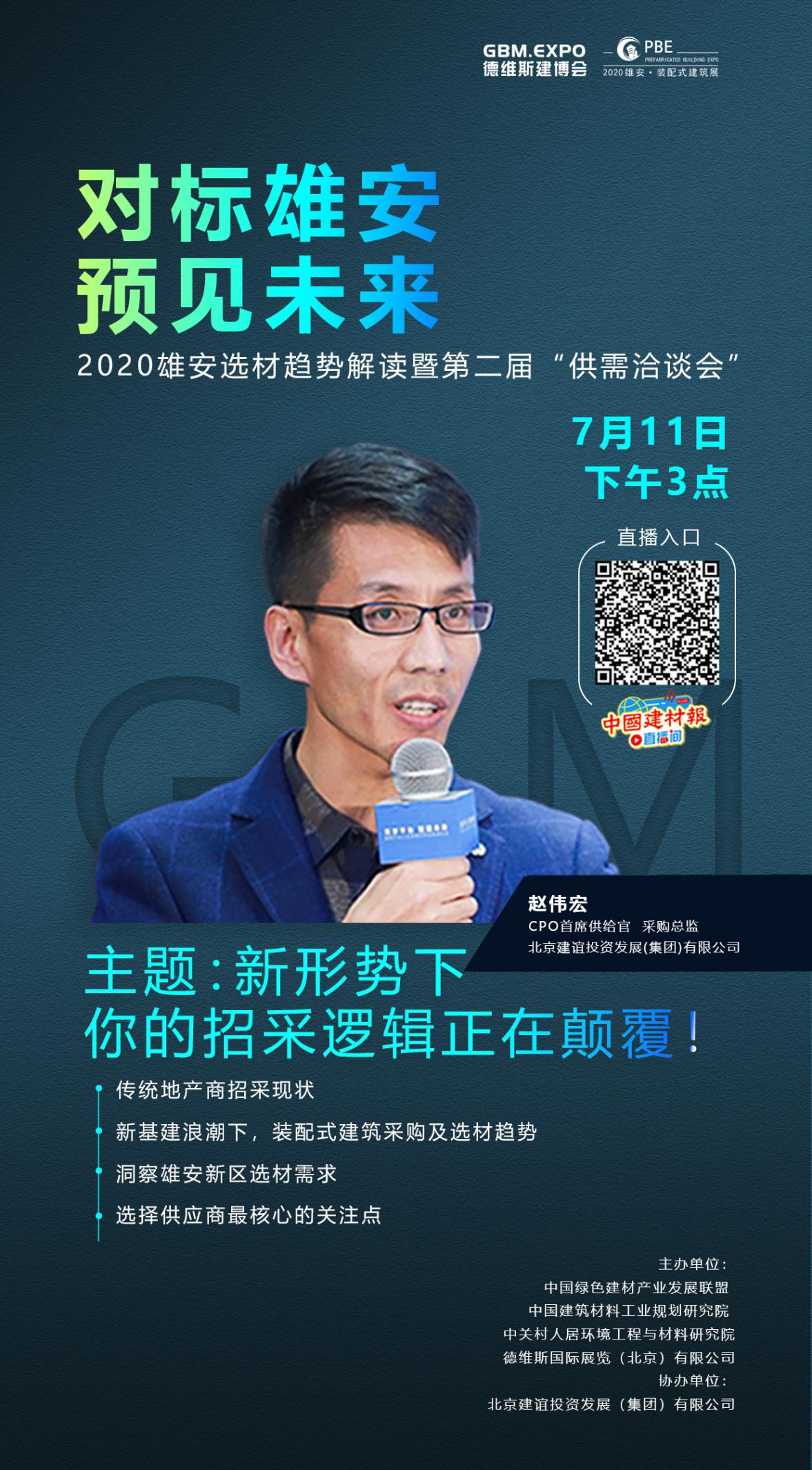 年7月11日,第四屆雄安德維斯建博會線上直播系列活動之——對標(biāo)雄安,預(yù)見未來:2020雄安選材趨勢解讀暨第二屆“供需洽談會”將邀請北京建誼投資發(fā)展(集團(tuán))有限公司采購總監(jiān)趙偉宏,分享傳統(tǒng)地產(chǎn)商招采現(xiàn)狀及新基建浪潮下裝配式建筑采購選材趨勢,講述海外地域經(jīng)濟(jì)招采管理經(jīng)驗、雄安新區(qū)選材要求。